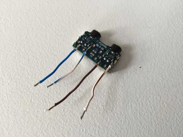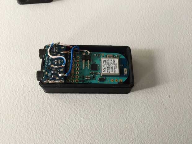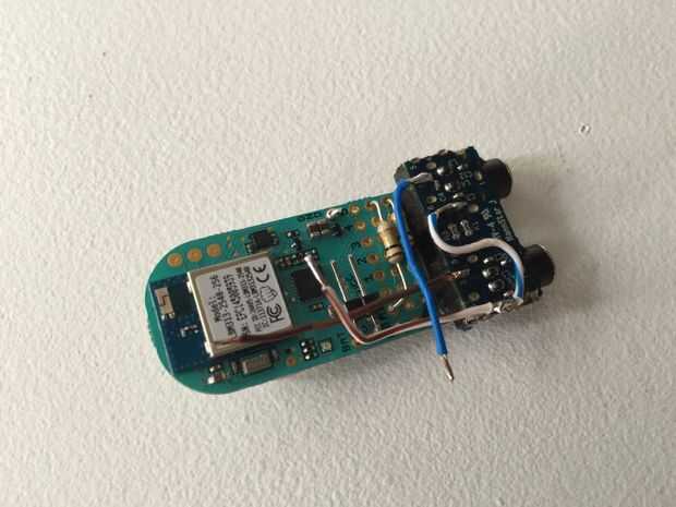 Para construir el circuito, podrido conectores de audio de 3,5 mm de un viejo PC roto. Se utilizó un multímetro para determinar los dos puntos en la placa que correspondía a la punta y la primera banda de la sonda. Los cables fueron soldados a las tomas audio y el fríjol como se muestra en las imágenes. Los conectores de audio fueron pegados al área de prototipo de la haba con cinta de doble cara. La cinta que utiliza es cinta de etiqueta de calidad que crea un vínculo muy fuerte entre las partes del remolque.