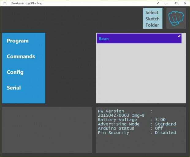 La compilación del firmware y subir el ciclo para el grano se hace través de Bluetooth. Sólo puede haber una conexión Bluetooth activa a la vez. El cargador de la haba está disponible de la Windows App Store