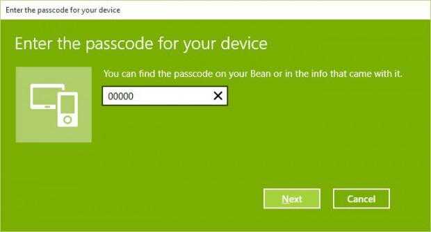 Finalmente windows informará "Listo a la par". En este momento puede hacer clic en el icono de frijol y después de unos segundos, Windows le pedirá que ingrese un código. La contraseña por defecto para la haba es 00000