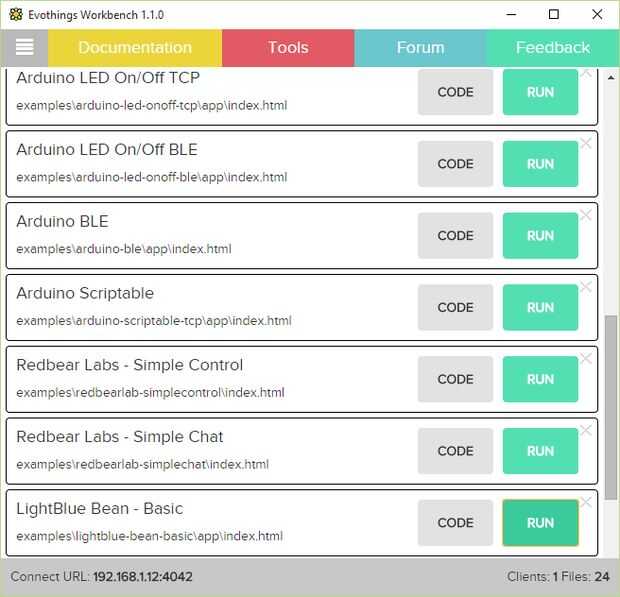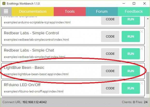 Una vez cargado el firmware, cierre el cargador de frijol para que la conexión entre el cargador de la haba y el frijol. Sólo puede tener una conexión a la vez. Ahora abre el Banco de trabajo EvoThings e iniciar al cliente de EvoThings en el smartphone o tablet.