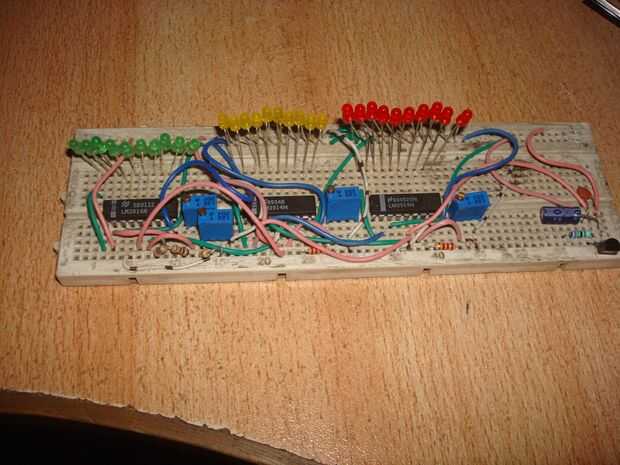 Ahora se debe calibrar el circuito. Tomar un multímetro de buena calidad preferiblemente Fluke, unidad-t o Mastech y conjunto que voltios ajuste. Conecte el terminal negativo del multímetro digital a la tierra y la energía en el circuito. Luego conecte el terminal positivo del multímetro digital al pin 4 del ic primer que es en el lado izquierdo en la imagen y el inferior en el esquema. Girar el preset conexión al pin 4 hasta lograr 90 mV. Luego conecte el pin 6 del CI mismo y girar el preset segundo hasta lograr 190 mV. Luego conectar el multímetro al pin 6 en el CI medio y girar el preset para lograr 290mV. Y luego conecte al pin6 el último ic y girar a la cuarta programación para alcanzar 390 mV.