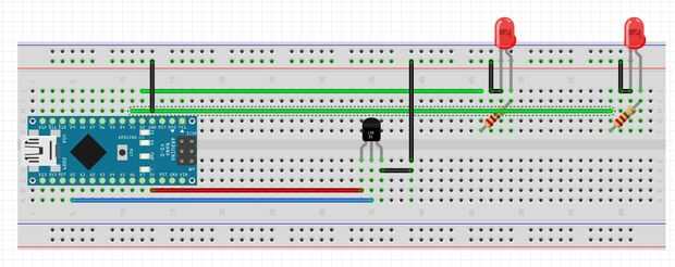 recientemente adquirí un Arduino Uno y estaba buscando un proyecto "getting started" cool. Decidí hacer un termómetro, como el kit he tenido todas las piezas necesarias (termistor, cables, resistencias, LEDs). A través de iteraciones de un par,