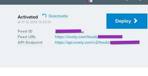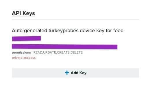 Una vez que el dispositivo es creado, usted será llevado a una página donde podrás recoger dos piezas importantes de información: la Alimentación ID y la API key para su alimentación. El feed que ID se encuentra en la esquina superior derecha de la consola y el API key es por debajo de ella, a la derecha de la página (el API key es largo). Ambos necesitan copiarse en el código de agente, en las líneas 38 y 39: