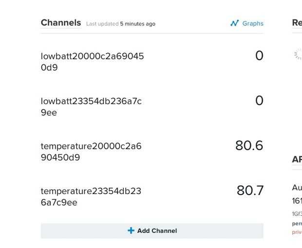 Una vez que hayas añadido estas credenciales a su código de agente, debe ser capaz de generar y ejecutar el código sin error. El dispositivo comenzará a tomar lecturas, y los verás aparecer en el registro en el IDE. En el tablero de Xively, verá dos nuevos canales creados automáticamente, uno a partir de "lowbatt" y uno a partir de "temperatura". Ambos nombres de canal añadir el ID de dispositivo de su nuevo termómetro, así que usted puede utilizar el mismo agregador una y otra vez con muchos termómetros y cada dispositivo sabrá sólo actualizar y utilizar sus propios datos.