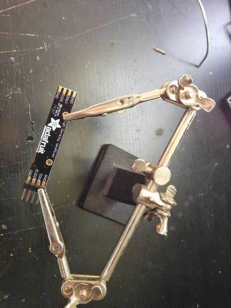 Del diagrama fritzing el circuito es un poco confuso pero es en realidad relativamente simple. Es importante tomar nota que vas a porque algunos ruido causado por los píxeles mete a la lectura de voltaje de la TMP36 y a su vez la lectura de temperatura TMP36 en un circuito separado del resto del proyecto. Cuando se trata de los píxeles un poco una soldadura va a tener que pasar. Vas a querer usar 4 cabeceras llanos, todos los días y soldarlos directamente sobre el palo de NeoPixel. Es absolutamente imperativo que se sale el pin correcto en esto de lo contrario tendrás que de y resoldar las cabeceras y confía en mí, las almohadillas de cobre en la NeoPixels no como ser resoldered y NeoPixels no son el componente más caro del mundo, varias varas que se inutilizó porque las almohadillas de cobre han sido sacadas se suman rápidamente. Para la soldadura te querrá una buena plancha y una soldadura con una galga fina. Un par de "tercera mano" son especialmente útiles en este proyecto como los encabezados pueden ser difíciles de soldar en el palo recto si el palo está mintiendo sobre la mesa.