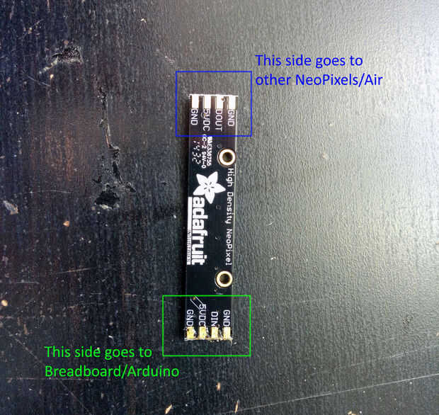 He incluido una foto con la orden pin correcto, el lado con "Estruendo" va a la protoboard/Arduino y el lado "Duda" va a otros píxeles o simplemente el aire. Usted puede utilizar cualquier número de NeoPixels, uno en el estudio tiene 4 palos para una lectura especialmente prominente hacia fuera que sería ideal si se va a encerrar en un láser cortar acrílico pantalla (posiblemente atentos). Por otra parte y como se ve en una de las fotos, tengo uno más pequeño con sólo un palito que funciona muy bien en el hogar que usted puede también girar en una exhibición montado en la pared con una caja muy rápida. Esta es una de las cosas con NeoPixels que las hacen grandes, que no tarda mucho código para caber casi cualquier factor de forma o tamaño.