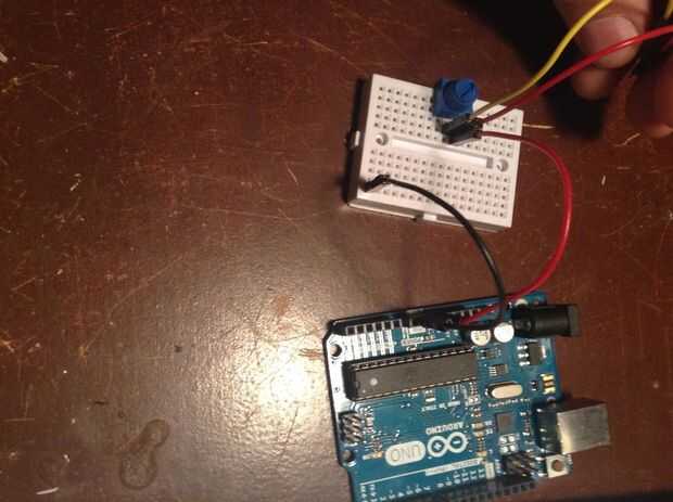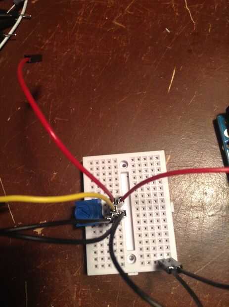 2) Inserte el potenciómetro de ohmio 10 k en la placa que se conecta a 5V en un lado y de la tierra en el otro. No importa qué lado es que, así que elige uno e ir con ella.