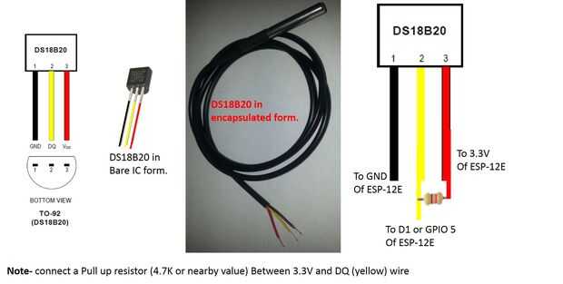** En general el cable negro es tierra, rojo es + ve VCC (+3.0 a + 5.5V) y línea amarilla es la línea DQ o datos. En nuestro caso va a ir cable rojo a + 3.3V de NodeMCU o una alimentación externa de suministro con 3.3V regulado.