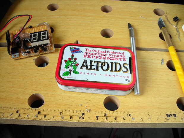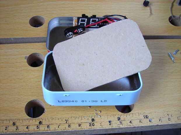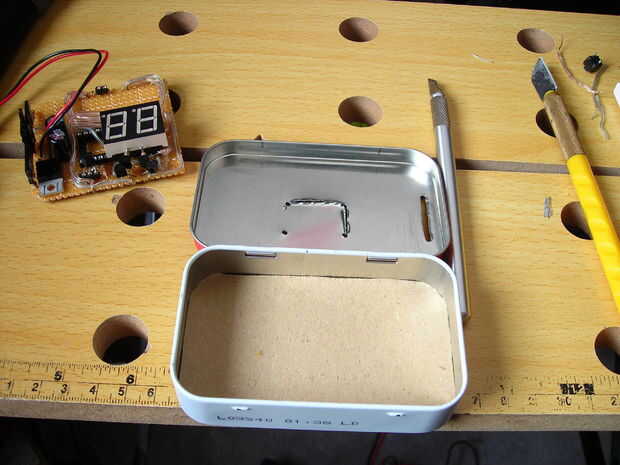 El primero es hacer los agujeros para la exhibición de LED, resistencia variable, dos pulsadores momentáneos y el interruptor de encendido. Lo hice primero insertando la electrónica acabada en la lata. Manteniendo la bandeja en el mismo lugar exacto, utiliza un láser como guía para marcar los bordes de la parte, luego cerrar la tapa rayada a lo largo de la línea de láser marca donde cortar. Luego perforé cualquier esquinas (como el agujero de la pantalla). Finalmente, usé un cuchillo del exacto para cortar a lo largo de las líneas. No te preocupes por deformación del metal alrededor de los bordes demasiado, se puede fácilmente ser aplanado más tarde poniendo un bloque de madera en un lado, y golpear el borde ligeramente con un martillo.