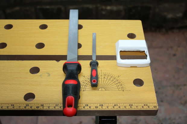 Ventana en cubierta plástica de que Finalizamos con archivo sistema, con tamaño apropiado de la escofina. Hecha la ventana actualizar cuidadosamente, ya que las líneas de corte no podrían ser reparadas.
