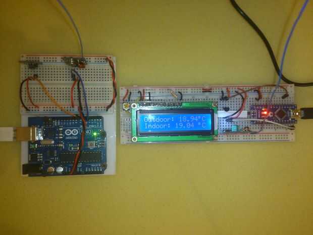 Me gustaría presentarles a uno de mis proyectos interesantes. Es un termómetro inalámbrico que mide la temperatura interior y exterior. El dispositivo consta de dos partes. Uno es un transmisor que contiene un sensor de temperatura digital y un módulo de transmisor. Un segundo receptor que consta de una pantalla LCD, el sensor digital y recibe el módulo.