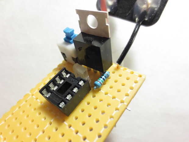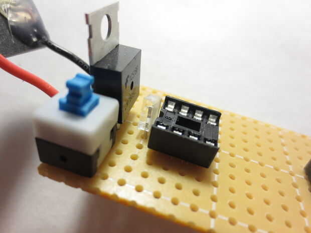 6. Compruebe su pulsador. Este es un paso muy importante porque si no tienes el botón soldar correctamente, todo el circuito no funcionará. Tiempo para tirar hacia fuera del multímetro! Conecte un extremo a GND en el tablero y el otro al pin 3 del zócalo. Encienda el circuito (enganche de botón, LED debe encenderse) y pulse el botón. Si todo va bien debería obtener 5v cada vez que presione el botón. Si todo no va bien, vuelva a comprobar las conexiones y consulte el esquema.