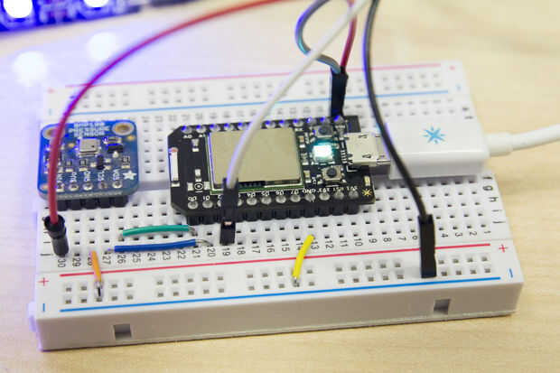 Conectar la tira V_in, GND, y la línea de datos a D2. Lo hizo rápido y sucio, pero si quieres hacerlo bien recuerda que Adafruit recomienda una resistencia de 470 Ohm entre la línea base y datos. Si utiliza una tira más larga debe considerar fuente de alimentación externa.