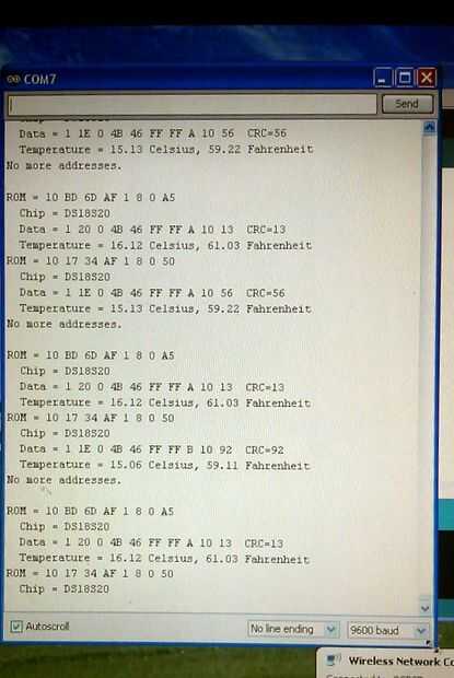 Solo estoy usando el programa de ejemplo incluido en la biblioteca de un cable. Muestra la dirección de cada chip, los datos en bruto y la temperatura en C y f el.