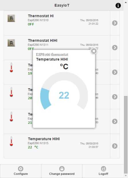 Entrar en servidor EasyIoT (plataforma Windows o frambuesa Pi) y añadir nuevo termostato en configuración. Si has hecho todo correctamente debería ver termostato en interfaz Web.