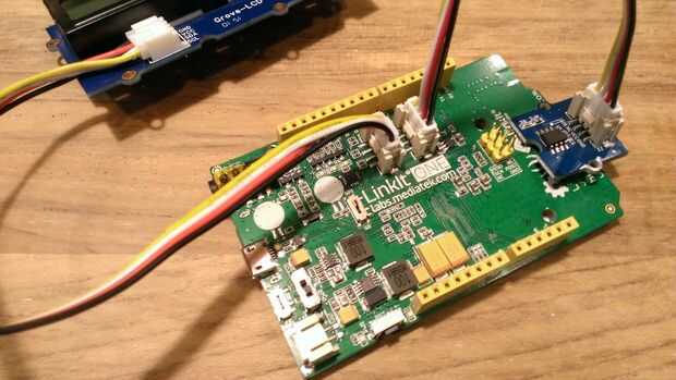 Para nuestro LCD, estoy utilizando una pantalla de LCD de Grove. Éste lo hace súper práctico que solo conectarlo y tener algo trabajando muy rápidamente. Simple enchufe en la ranura de la arboleda en su LinkIt uno y estará listo para ir!
