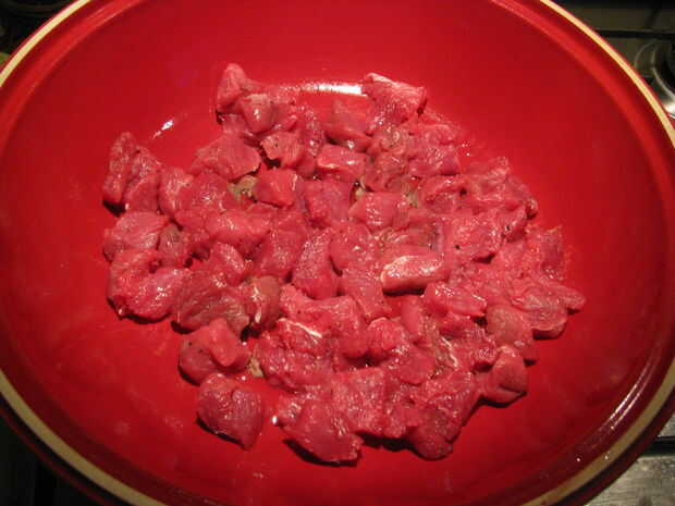 Vierta 4-5 cucharadas de aceite vegetal dentro y cuando calienta agregar las piezas de carne también.