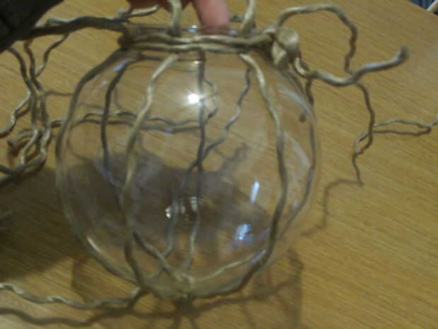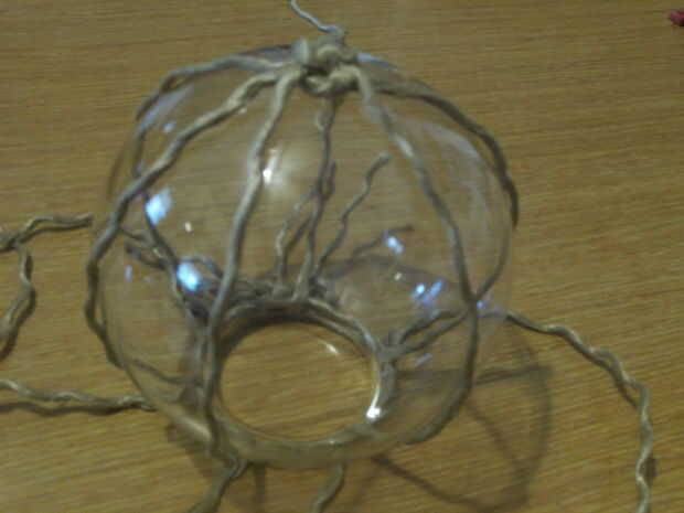 Mida el largo del cordón deseado, tendrá suficiente apoyo de cada lado que su terrario no se deslizará hacia fuera. Aquí utilicé tres cuerdas diferentes. Atar cuerdas todos juntos por un nudo en el medio de cada filamento. Atar cada filamento a otro así que nadie filamento puede deslizarse a través de. Se reúnen todos los extremos de manera uniforme alrededor de la nave y mantenga presionado en la parte superior del vaso. Amarre otro pedazo de cuerda firmemente alrededor del cuello, sosteniendo todos los filamentos verticales, que usted puede tirar de les en su lugar más adelante. Atar las tapas en un lazo o nudo y agregar a un lindo-dad en los extremos de la pieza de cuello corbata.