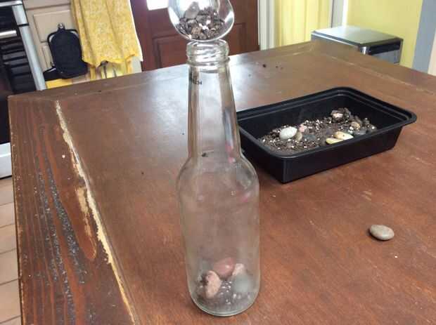 El primer paso real es que sus rocas en la botella. Después de tener como seis rocas ahí, vierta una pequeña suciedad en la parte superior y pila en rocas más. Repita este paso hasta llegar a la altura deseada. Luego, vierta un poco de agua en la parte superior para hacer el suelo húmedo. Asegúrese de que dejar espacio para poner las semillas y la suciedad en la parte superior.