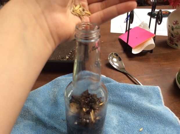 Estoy usando semillas de la hierba, pero hay muchas opciones, elegí sólo hierba porque es fácil y sería tipo de fresco. Salir sus semillas y luego girar la botella alrededor mientras viertes las semillas por lo que se extienden alrededor igualmente. Poner un cuarto de pulgada de la suciedad en la parte superior a continuación, poner un poco de agua en la parte superior. Ahora puede ver su terrario pequeño crecen y crecen!