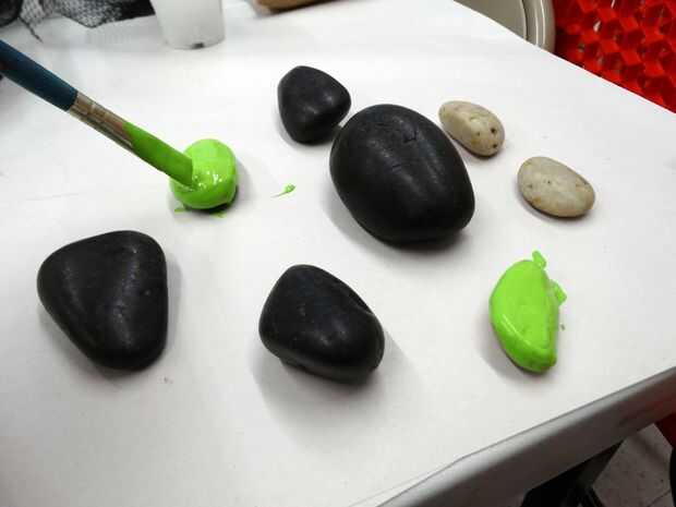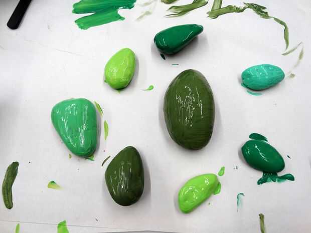 -Tome sus rocas de cactus y diversas pinturas verdes y pintar el color base de los cactus en todas estas rocas. Si sólo tiene un color verde oscuro y una pintura verde luz, usted podría intentar mezclarlos en diferentes cantidades para lograr tonos más verdes de las cactáceas.