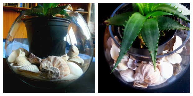 Poner la planta en el recipiente de vidrio y empezar a llenar con las otras conchas.