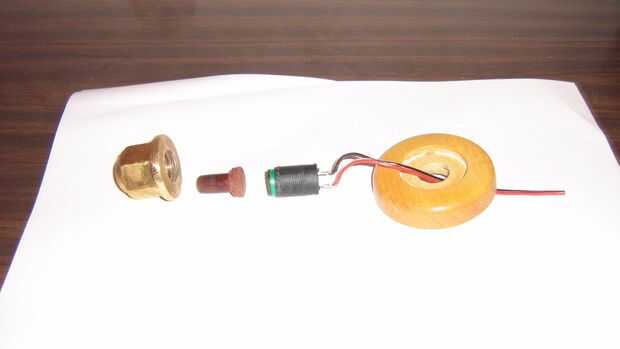 El cuerpo principal del interruptor es bronce y tiene un agujero en la parte superior para el émbolo de madera que activa