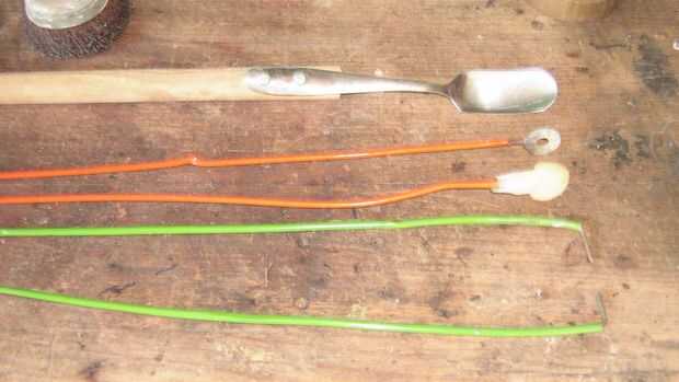 La cuchara de la pala, es una cuchara con los lados tierra y se atornilla en una varilla de madera de 15 pulgadas.