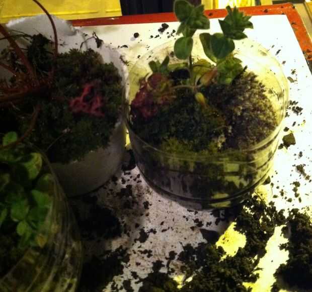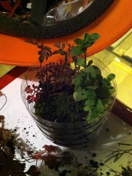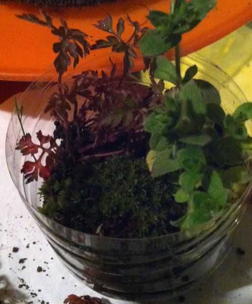 recopilé mis plantas en una taza de espuma... oh tan elegante:-). Luego puse los elementos en el contenedor (la parte inferior la mitad de un botella de agua-uber portable y discreto) de abajo a arriba como sigue: suciedad, piedras, tierra y plantas. Como se imaginarán, delgadas capas de cada uno. Como la estética del arreglo floral... Trabajo en una fábrica de acero... Me gusta el aspecto de esto pero estoy seguro de que hay parámetros que rendiría mejor fotosíntesis, crecimiento, etc., pero voy a probar esto. Yo estoy llamando a este proyecto completo! Los dos en la parte inferior de la botella son para uso inmediato: uno en mi grúa y uno en mi coche. Viene en la Copa de espuma casero conmigo para otro proyecto de terrario lo he planeado. Feliz cultivo!