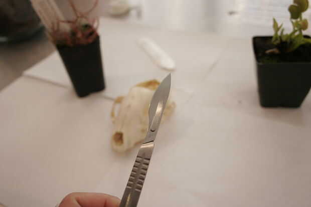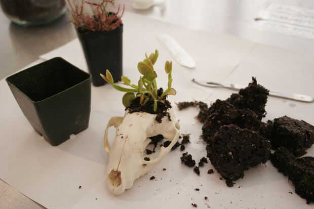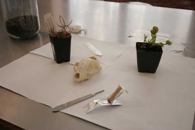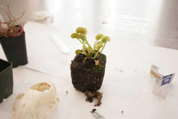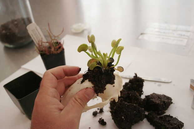El suelo que vino con la drósera fue bastante flojo y cayó aparte bastante cuando unpotted la planta por lo que había mezclado con el resto. El mosquero tuvo que recortarse su cepellón un poco para encajar en el cráneo "jardinera" y tuve cuidado de apartar la capa de musgo creciendo en él. Las raíces de ambos estaban cubiertas todavía bastante en el suelo llegaron.