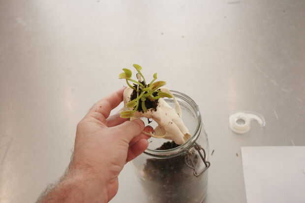 Mounded el suelo un poco bajo el cráneo y cavó un agujero bonito para el atrapamoscas.