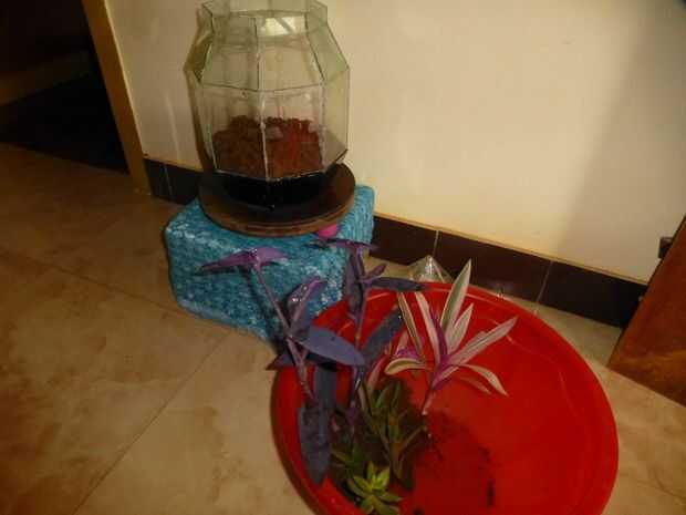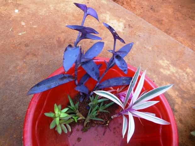 Aquí he seleccionado algunos planta corazón púrpura (Tradescantia pallida), planta de ostras (Tradescantia spathacea), suculentas como Echeveria y una variedad enana de cactus.