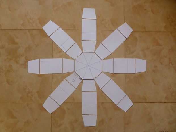 - Sección inferior: será de vidrio espejo grueso 5 mm, por lo que la mezcla de rellenado no será visible desde el exterior. Esta sección constará de pieza "A" corte número uno en forma octogonal. Las dimensiones serán de 60 mm para todos los lados octogonales con un radio de 80 mm. Pieza "B" será de forma trapezoidal con tapa m 80, fondo 60 mm y altura 60 mm. 8 números de esta forma se requieren en vidrio de 5 mm espejado.