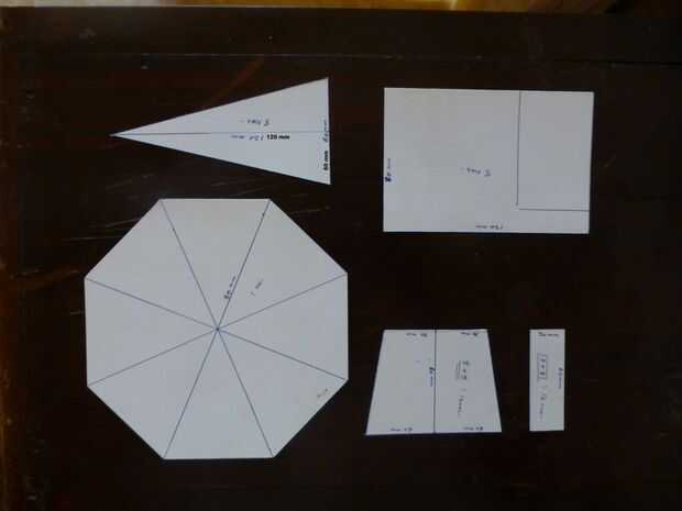- Sección superior: Parte superior será de dos formas - otra vez "D" 8 números, dimensiones y la forma misma. Pieza "E" será de forma triangular. 8 números de estas piezas se requiere en cristal transparente de 2 mm, las dimensiones son base 60 mm y 120 mm de altura.