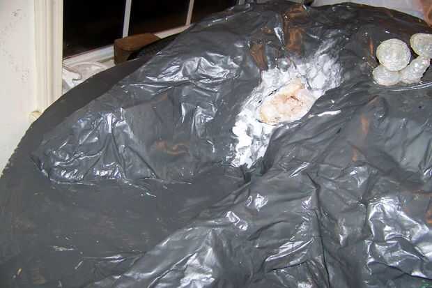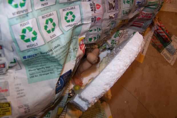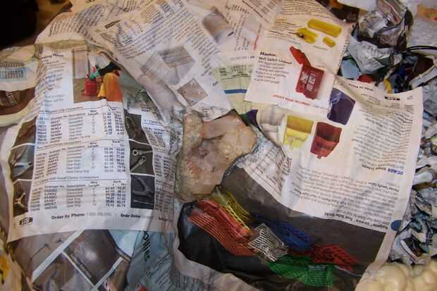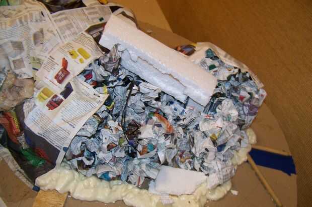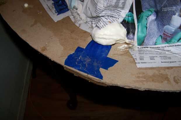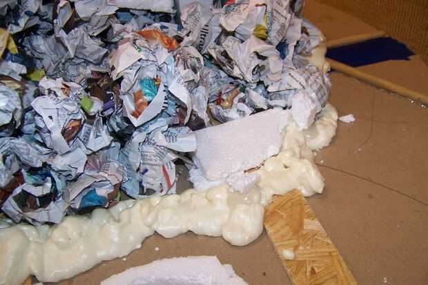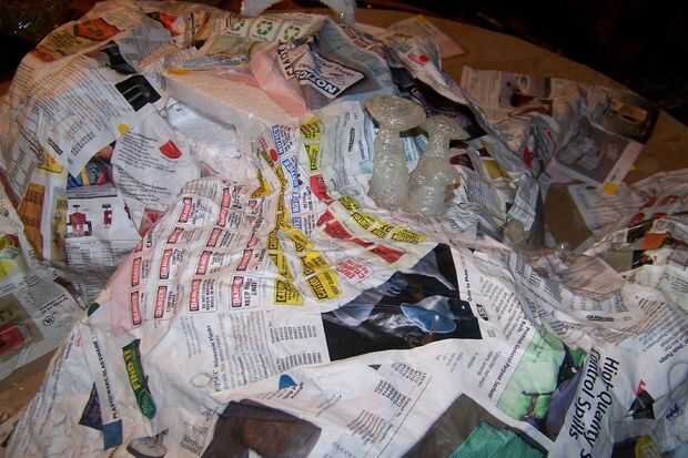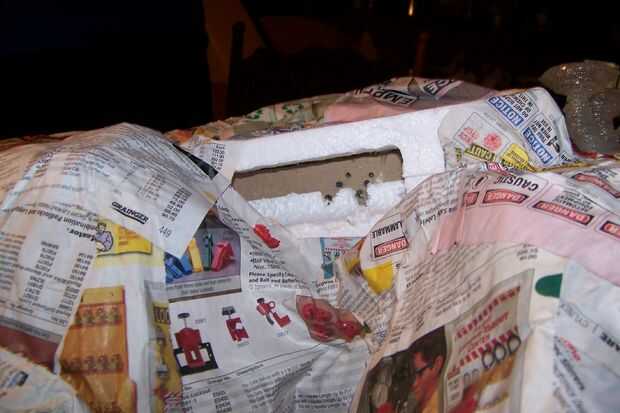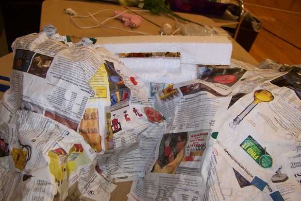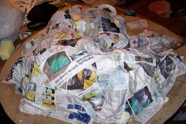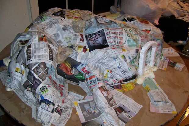 Utiliza un catálogo de granger y arrancadas y había mirado las páginas y ponerlas en el contorno de la espuma de solucionador de problemas. Tomé el pegamento blanco y mezclado con agua hasta que parece ser una buena consistencia. No era una proporción exacta de agua para pegar, pero en cualquier caso se deslizó páginas del catálogo a través de la mezcla y coloca las páginas sobre el papel balled para arriba en el estante.