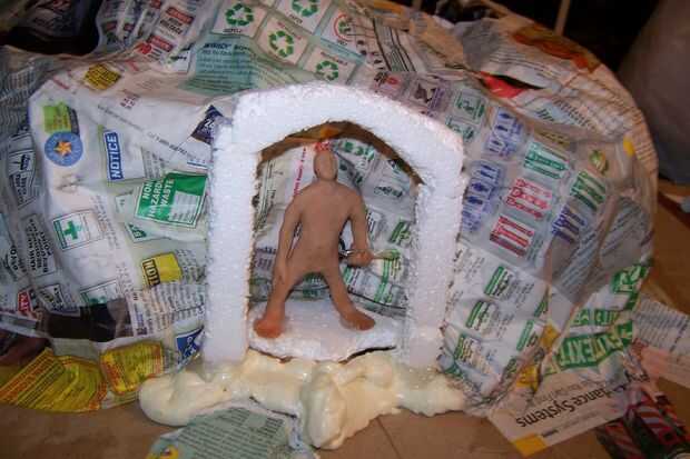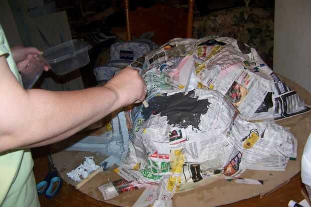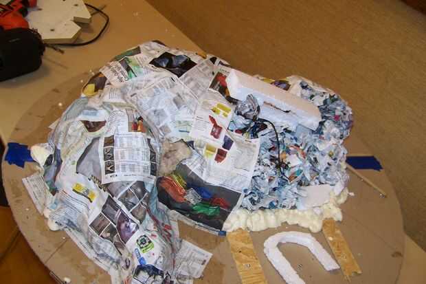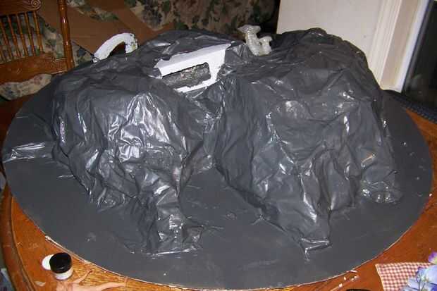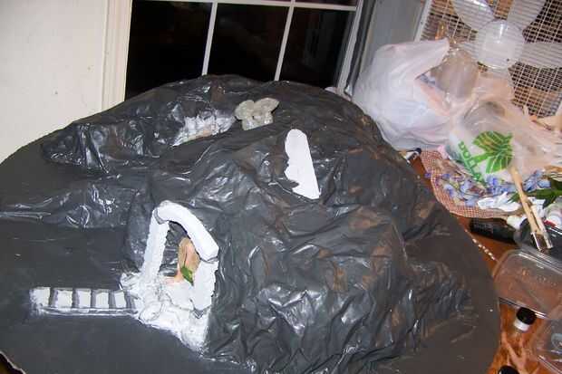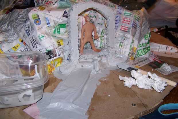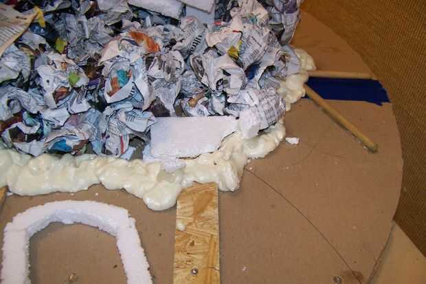 Usé un solucionador de problemas de "grandes cosas" para construir el pie de las montañas. Esto dio una agradable textura rocosa y fue bastante barato. Tengo la idea de un tutorial que hace de apoyo-árbol que vi. Originalmente quería construir todo el asunto de la espuma porque pensé que sería cool, pero una lata de espuma no cubre área muy mucho, así que me alegré de que llené en el contorno de la espuma. Entonces tuve que averiguar cómo construir el resto del paisaje. Decidí que utilizaría papel maché '. Pensé que sería necesario algún tipo de molde, pero resulta que era capaz de la bola de papel y colocar papel húmedo sobre él. Puedes ver cómo funcionaba en las siguientes imágenes.