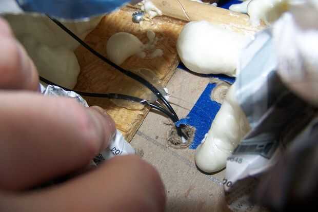 Cuando había recibido dos tercios de la manera a través de las montañas, yo deje que se seque durante la noche. Simplemente me quedo sin tiempo para trabajar en ella, así que lo dejó y volvió al día siguiente a trabajar más. Cuando llegué a un punto en mi diseño que requieren efectos LED o apoyos sería averiguar cómo estabilizar y attatch a la zona. Utilicé un soldador, taladro, cinta de pintor azul y pegamento caliente para ejecutar el cableado a través de la tarjeta y los LEDs. Caliente pegué los cables a las afueras de donde llegaron a través de la tarjeta. Esto ayudaría a mantener los cables de tracción a través de cuando les soldadas a la placa más adelante.
