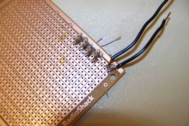 En algún lugar durante ese proceso yo también soldar las resistencias a la PCB en paralelo conectando a 5V y tender un puente sobre a una zona desconectada. Más adelante sería soldar el positivo del led a esta zona y la negativa a la línea de tierra en el PCB. Usted no necesita usar un PCB para esto en todos, pero sólo quería.
