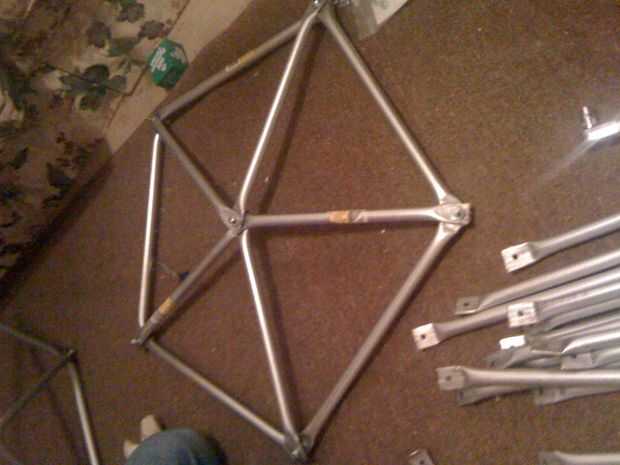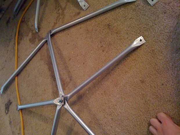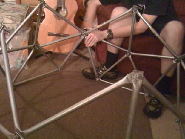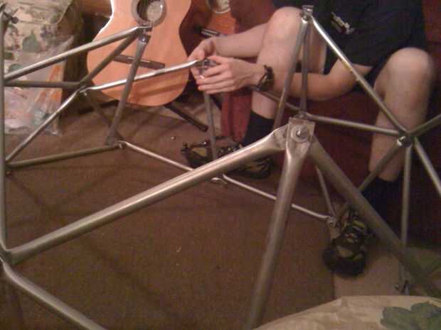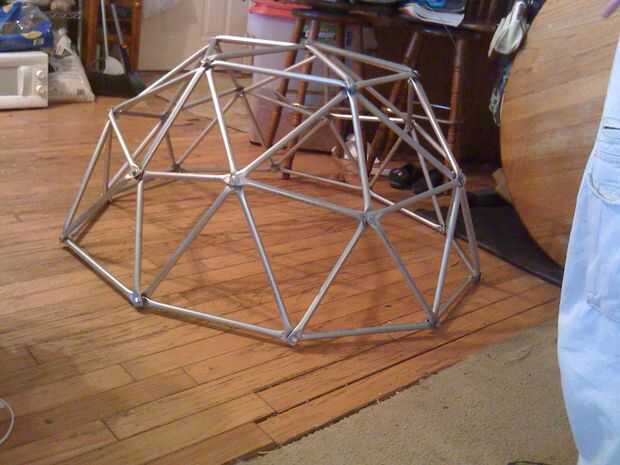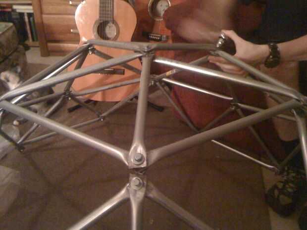 Montar seis pentágonos para iniciar, y al conectarlos todos juntos entonces puede montar otro seis pentágonos. Algunos de los pernos serán redundantes, que no deje suficiente para montar la cosa entera a la vez. En otras palabras, hay suficientes tornillos para montar la esfera entera, pero no sendas cúpulas. Cuando hacer los pentágonos intentar espiral interno puntales de manera consistente así que la torcedura durante todo el proyecto será uniforme. Entonces llegará a ser unnoticable. De lo contrario puede hacer su esfera extrañamente formado.