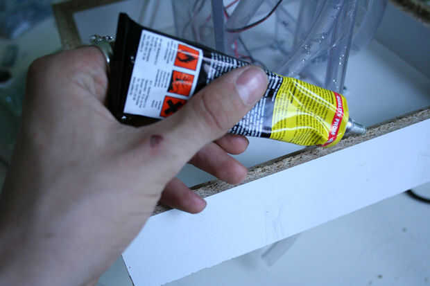 Luego asegúrese de que todo arenas nuestro anuncio de maby se inclina algo cuando pegue los lados del cubo en la parte inferior de madera. Y también el tubo de agua que uno mismo para que no esté en tu camino.