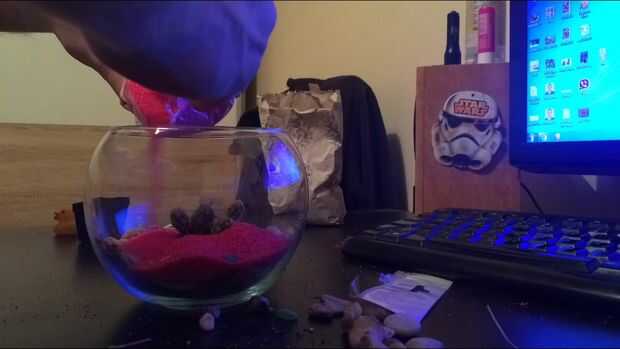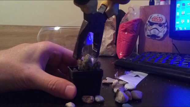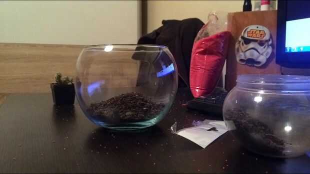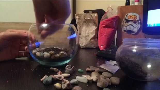 Primero poner suelo, aproximadamente de 2 a 4 cm. Capa siguiente, debe poner una cantidad pequeña de piedras, sólo en los bordes, para que usted disfrute como un círculo alrededor de la tierra. Debe ser pequeña cantidad de piedras, así que usted puede plantar Cactus en el suelo. Planta del cactus o succelent, estén firmes en el suelo!