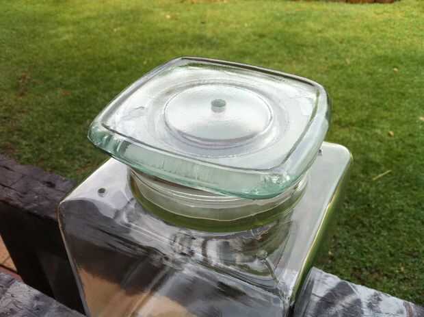Aunque el terrario es una unidad sellada, algunos ventilación es bueno tener. Taladré un agujero de 4mm en cada esquina de la jarra y un orificio de 8mm en el centro de la tapa para permitir que las luces LED del jardín para pasar a través. Una vez que haya terminado de perforar, lave la jarra de agua caliente y jabón y quitar las etiquetas. Enjuague el recipiente y deje que se seque.