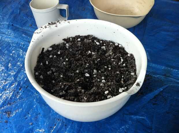 Plantas suculentas quieren un suelo que drena rápidamente y no retienen mucha agua. Para ello combinamos la mezcla de rellenado con arena. Usé aproximadamente una proporción de 1 a 1. Algunos perlita también fue agregado sin embargo puede llegar lejos sin él.