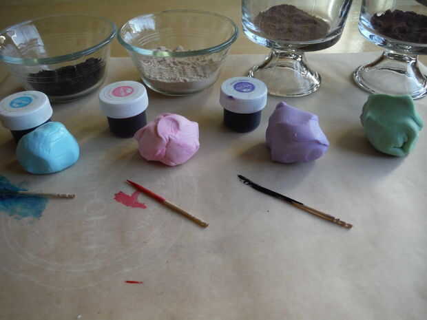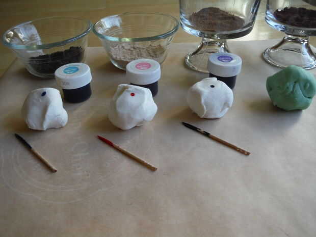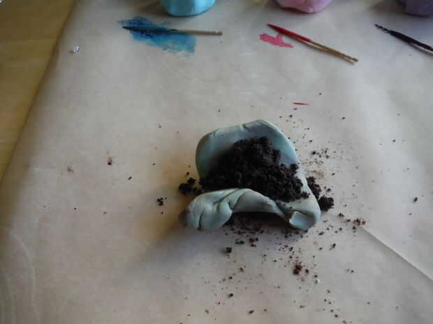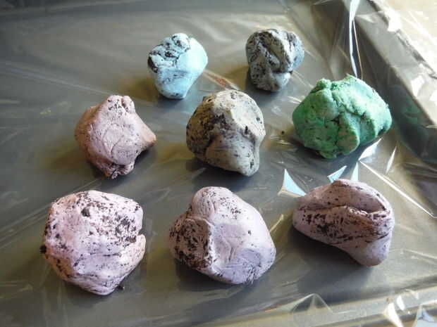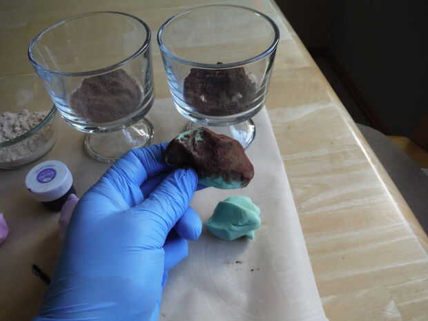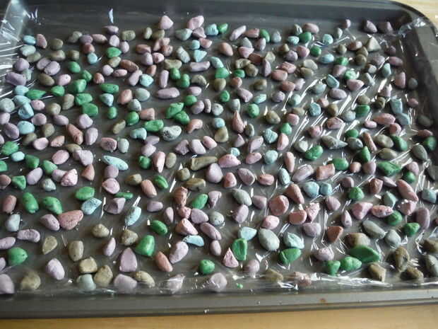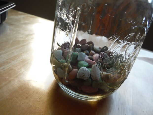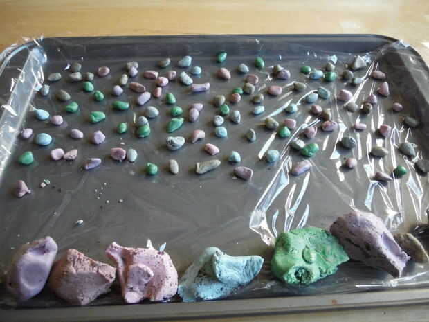 Pizca de pelota de golf de 3 a 4 tamaño trozos de blanco modelado de chocolate al color con su elección de colores de alimentos. (Usar color de rosa, azul, púrpura y agarró un pedazo de mi verde modelar chocolate en vez de colorear otra sección verde.) Dividir cada sección de color en dos bolas, inmersión en diversos colores de cacao o mezclar diferentes cantidades de migas de Oreo en obtener ahora ocho bolas de arcilla de diverso color caramelo. Si usted necesita añadir un toque más color de alimento a algunas secciones para que no queden más, seguir adelante. Pellizcar pequeñas cantidades de arcilla en los dedos, el rodillo alrededor y buscando piedras irregulares formas. Que endurecen en envoltura de plástico sobre una bandeja para hornear galletas. Coloque las rocas de chocolate caramelo en tus tarros de mason encima los pedacitos de carbón.