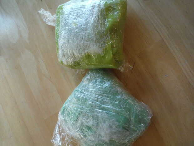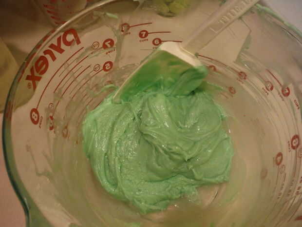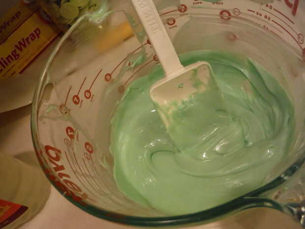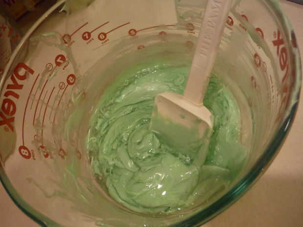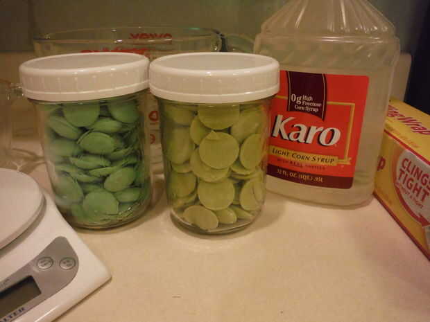 Por cada 4 onzas de candy melts, necesita 1 onza de jarabe de maíz. Tenía 12 onzas de ambos el verde caramelo se derrite, usé 3 onzas de jarabe de maíz de cada para convertirlos en modelado de chocolate. Sólo tenía 8 onzas de los derretimientos de caramelo blanco, usé 2 onzas de jarabe de maíz.