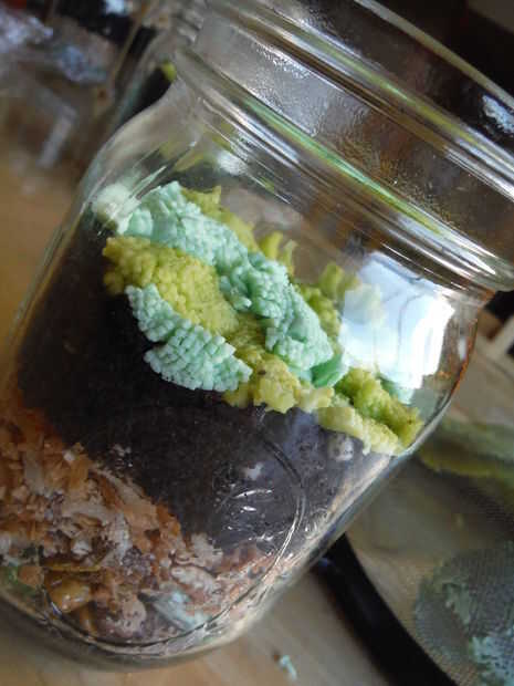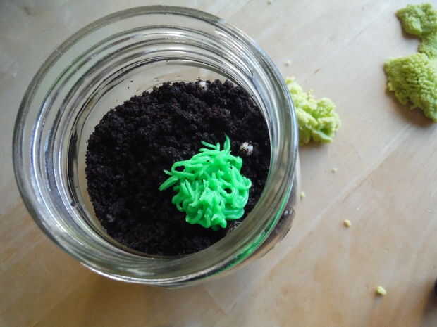 Para lo no-baker: se puede sustituir la fondant comercial (la de color verde incluso) para utilizar en lugar de modelado de chocolate para el musgo. También puede comprar verde betún en una bolsa y la punta de la "piel/de la hierba" para ir a tapa y tubo a cadenas de helar para representar pastos en su terrario.
