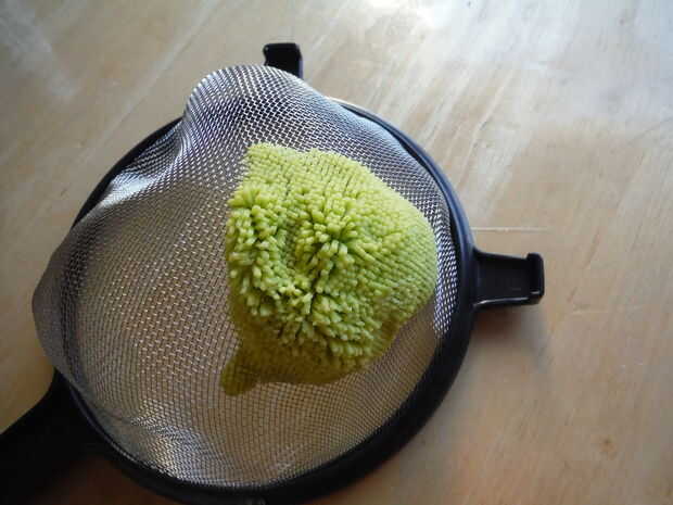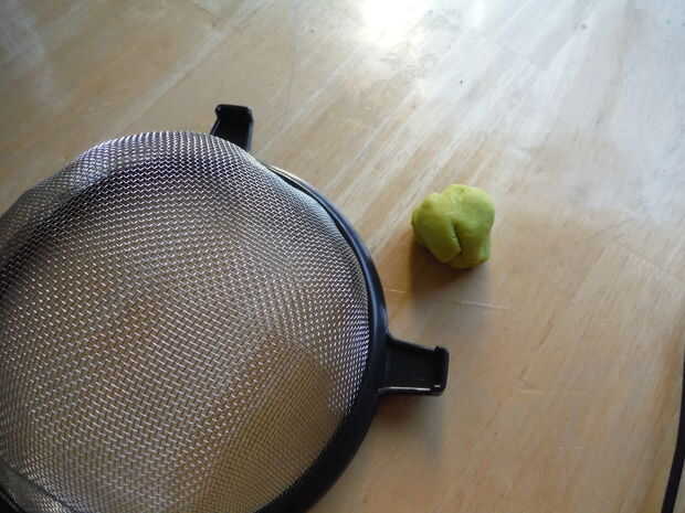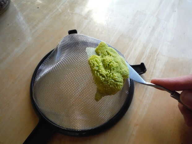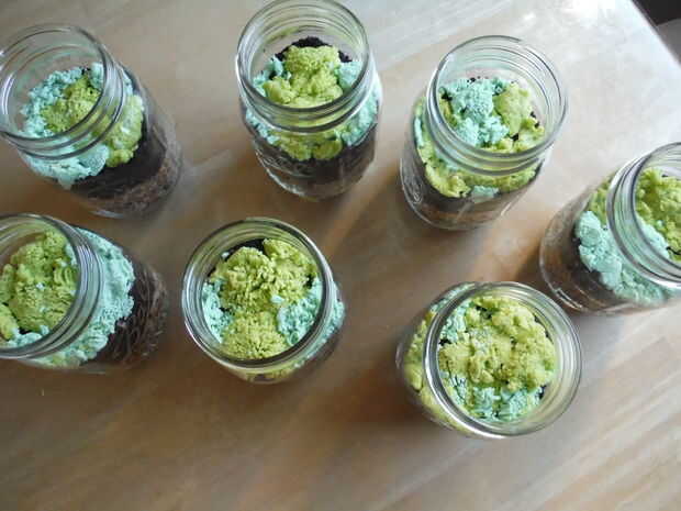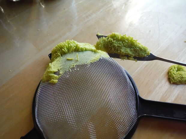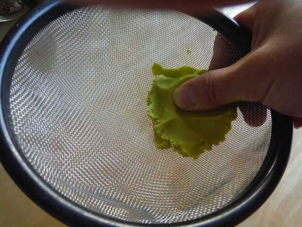 Tome un pedazo pequeño de amasado modelado verde chocolate y empuje a través de la parte posterior de un tamiz de malla fina, como el que se utiliza comúnmente para cierna los ingredientes secos en una receta. El modelado de chocolate debe presionar arriba a través de pequeños agujeros en el tamiz y parecen pequeñas matas de musgo o la hierba que sale de la parte delantera. Raspar una sección o dos con un cuchillo y colocarlos en sus frascos. Y si te sientes especialmente valiente, puede pruebe pulsando un color a través de un poco y luego cambiar a un color diferente detrás de él y salir con two toned/ombre color musgo o plantas. Cuanto más presionas el modelado chocolate, cuanto más tiempo el musgo será--hasta que se parece más a hierbas largas en vez de musgo. Depende de usted cómo largo o corto cómo desea que sus plantas, usted está en control de sus impulsos artísticos!