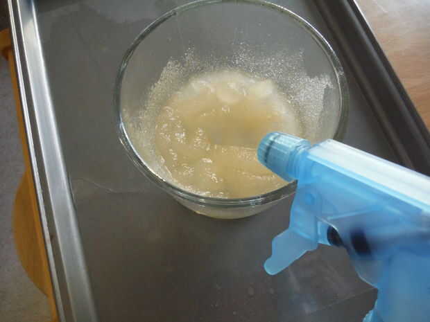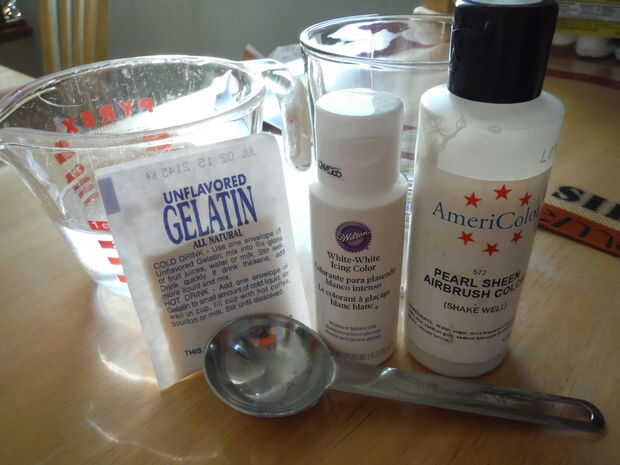 Espolvorea uniformemente el paquete de gelatina sobre el agua fría en un tazón para microondas. No mezclar aún. Use una botella de squirt para rociar con moderación las secciones que no se convierten en húmedo. Calentar en el microondas durante 30 segundos, 10 segundos a la vez para que no hierva. Capa superior de la capa superficial turbia blanca y squirt en un poco del color de brillo perla y una gota o dos de color blanco si le gustaría un poco más opaco. Ahora usted puede mezclar la gelatina y el color junto y extensión hacia fuera sobre una hoja de acetato para secar de 6 a 8 horas, o hasta que se empieza a pelar hasta en las esquinas. Cortar la hoja de gelatina en pequeñas secciones y moler en una licuadora o molinillo de especias hasta que quede tan fino o grueso que quieras. Voila! Que acaba de hacer brillo comestible para su terrario de escena de invierno.