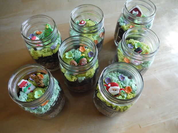 Terrarios tradicionales se vuelven caprichosos paisajes con rocas, juguetes, figuras, animales de plástico y otros tesoros. Esto es aún más cierto para nuestra versión comestible mediante el uso de figuras de azúcar, galletas y brillo de nieve comestible.