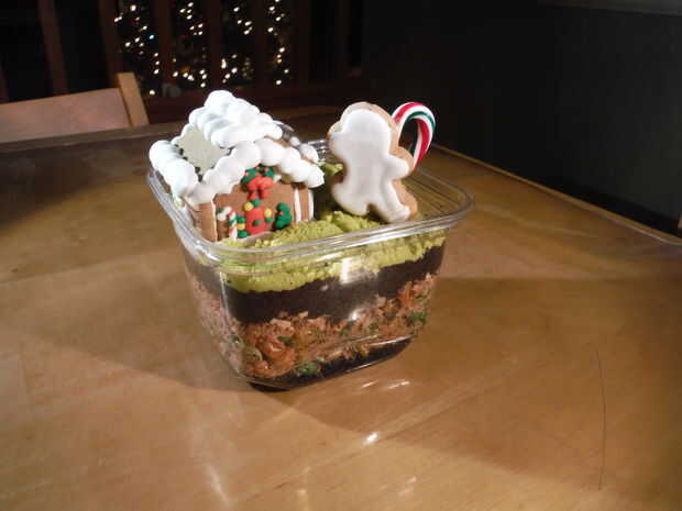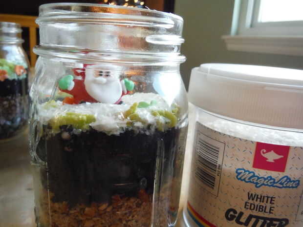 Accesorios de glaseado real, flores de pasta de azúcar, lo que puede encontrar en la tienda en el pasillo de la hornada es juego justo para su terrario. Usted puede incluso hacer galletas de jengibre pequeño y pan de jengibre mini casas para mostrar en tus tarros de mason comestible. Tenía blanco brillo comestible a la mano para replicar la nieve en algunos de mis terrarios. Si no puede encontrar comestible brillo blanco en la tienda, puede hacerlo usando la siguiente receta: